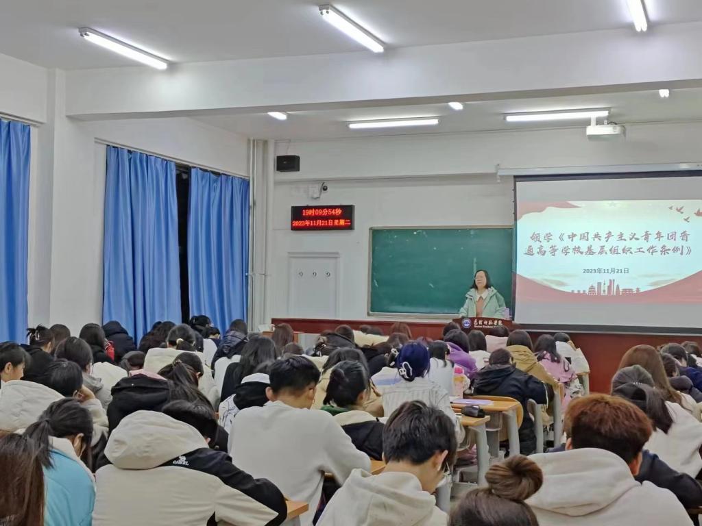 在会上,方丽慧领学了《条例》全文并介绍了《条例》修订的背景和意义。党的十八大以来,以习近平同志为核心的党中央站在党的事业薪火相传、中华民族永续发展的战略高度,对青年和共青团工作高度重视、亲切关怀,习近平总书记对加强学校思想政治工作、发挥学校共青团作用等作出一系列重要指示批示。《条例》对共青团普通高等学校基层组织工作的指导思想、工作原则、组织设置、主要职责、团员队伍建设、团干部和青年工作骨干队伍建设、领导和保障等作出进一步规范,是新时代新征程加强普通高等学校共青团工作和团的基层建设的基础主干团内规章,对于坚持夯实基层的鲜明导向,持续巩固普通高等学校团组织在全团的基础性、战略性、源头性地位,在培养德智体美劳全面发展的社会主义建设者和接班人中充分发挥作用具有重要意义。