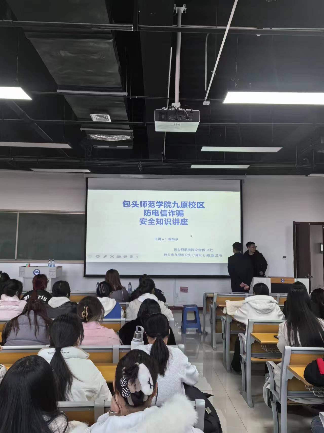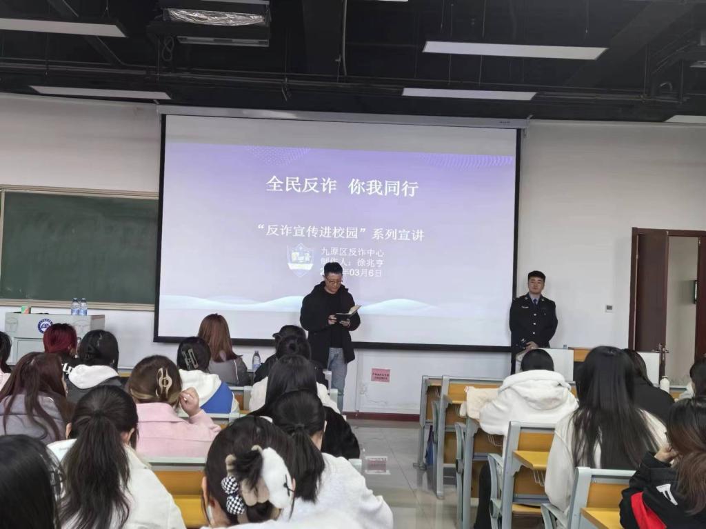 3月6日,我校在九原校区综合教学楼208教室举办以“全民反诈,你我同行”为主题的防范电信诈骗安全知识讲座;本次讲座由安全保卫处联合九原区公安分局知行路派出所共同举办,经济与管理学院、政治与法律学院班主任、辅导员及学生代表聆听此次讲座。