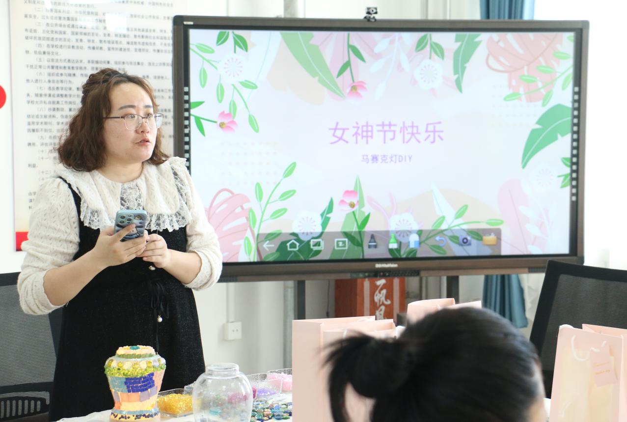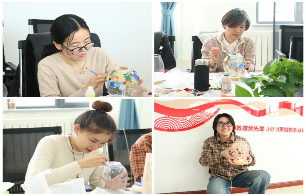 本次活动以DIY马赛克灯为主,在指导老师的协作下,教师们亲自动手体验,用色彩斑斓的马赛克片拼贴出自己的创意,用一片一粒拼缀出流光溢彩的世界,装饰出理想的马赛克灯。在制作过程中,老师们互相交流心得,分享彼此的创作灵感,沉浸在色彩斑斓的光影中。活动现场气氛热烈,一片欢声笑语。
