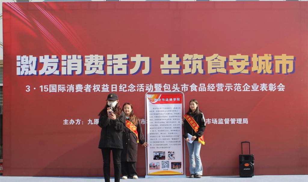 为提升公众的法律意识和防诈骗能力,切实维护消费者的合法权益,2024年3月15日上午,政治与法律学院携手九原区法学会在九原区万达广场联合开展了“三·一五”消费者权益日反诈普法宣传活动。辅导员赵鹏然老师及普法宣讲团成员参加了本次活动。