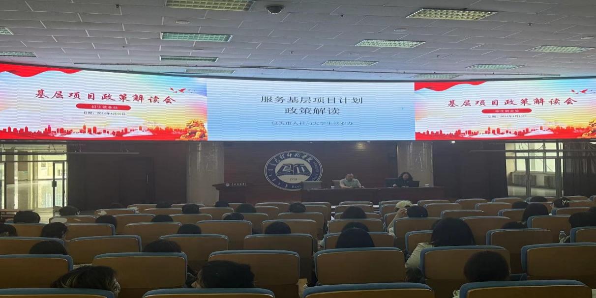 2024年4月10日下午,在博学楼学术报告厅举办服务基层项目政策解读讲座,讲座由招生就业处副处长秦嗣权主持,由包头市人社局大学生就业指导服务办公室副主任史佳钰主讲。各学院部分大三、大四学生参加。