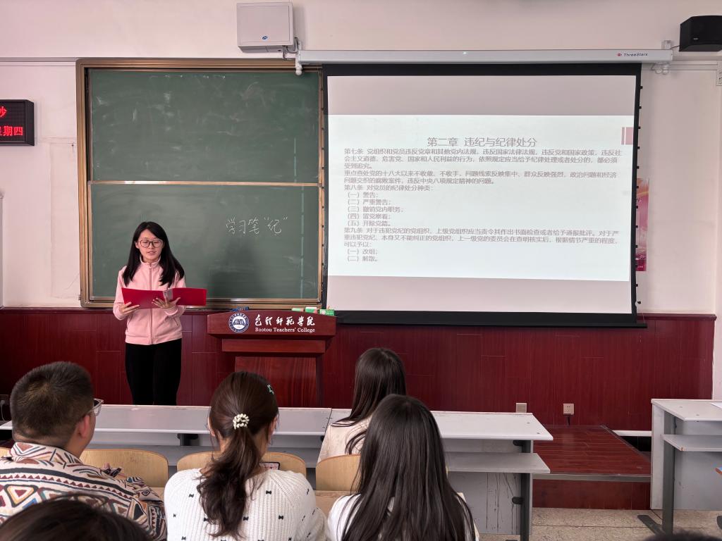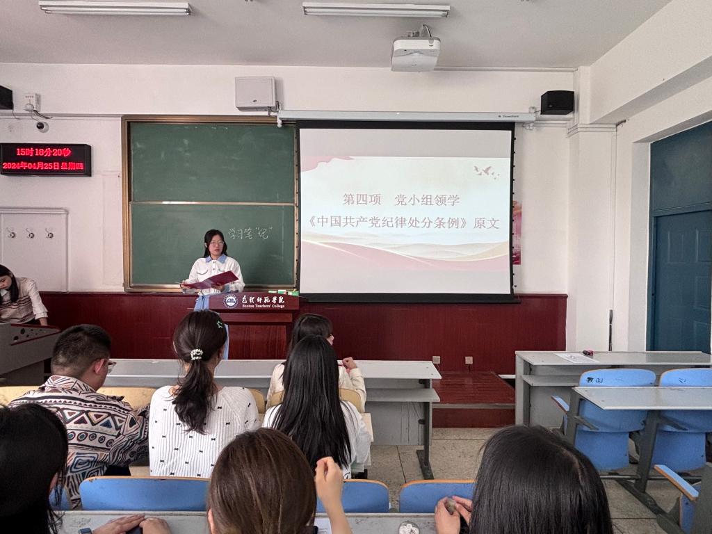 为深入学习贯彻习近平总书记关于党纪学习教育的重要论述和重要指示精神,进一步加强对支部党员的思想引领,提升其学习党章党规及党的最新指导思想的能力,4月25日,教育科学学院学生一党支部开展了“学党规党纪 守纪律底线”专题学习,会议由支部书记王璐然主持,全体党员参加。
