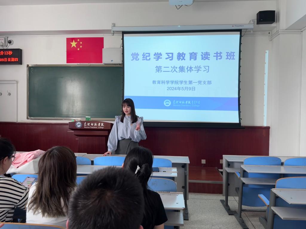 为进一步深化党纪学习教育,引导学生党员做到学纪、知纪、明纪、守纪。2024年5月9日下午,教育科学学院学生第一党支部开展“红色领航,师范先行”党建品牌之铸魂实践“学党纪 修党性”交流研讨暨警示教育大会党日活动,此次活动是党纪学习教育读书班第二次集体学习,由支部书记王璐然主持,30名学生党员参加。