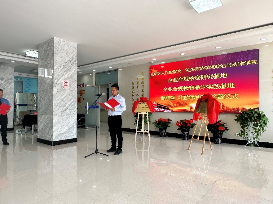 5月21日,九原区人民检察院与政治与法律学院设立企业合规检查研究基地、企业合规检查教学实践基地启动仪式,九原区人民检察院党组书记、检察长牛利军、党组成员、副检察长石峻升、党组成员、政治部主任于萍、办公室主任杨柄刚、第一检察部主任马敏、第三检查部主任姜旭、第一检察部副主任贾燕、第一检察部主任助理闫田侠、马宇;包头师范学院政治与法律学院党总支书记孙傲飚、院长高德胜、副书记崔彦、副院长魏成、法律系胡建虹副教授、苏惠芳副教授、孙涛老师、王蕊老师以及法学本科生、法律硕士参加揭牌仪式。