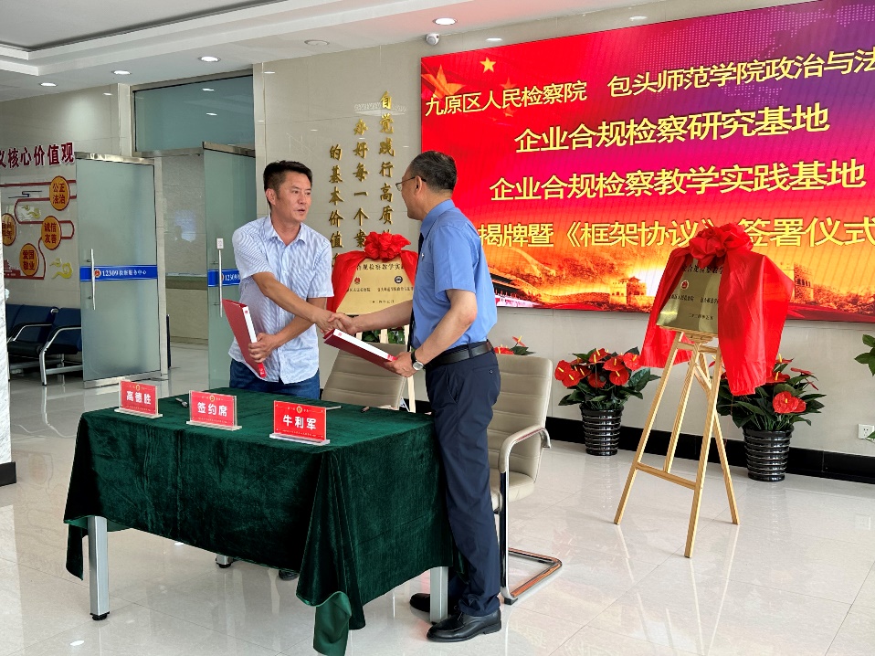 与包头市九原区人民检察院建设企业合规检查研究基地和企业合规检查教学实践基地是包头师范学院政治与法律学院贯彻落实关于高校进一步服务地方、培养新型应用法律专业人才的要求,也是基层检察院实践性、创新性工作和地方高校理论性、指导性工作有机结合的一次尝试。