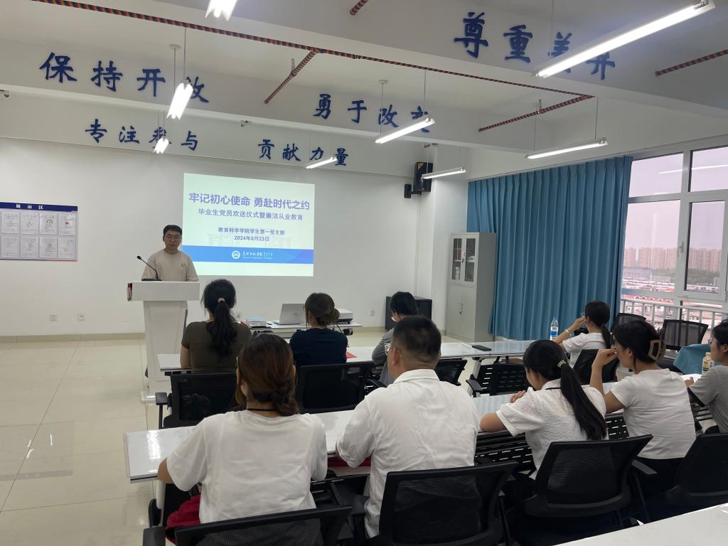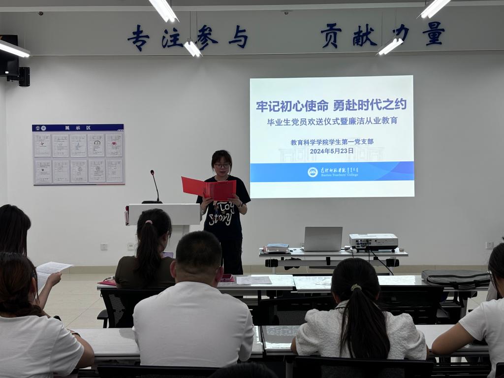 为提高基层党组织的凝聚力、战斗力、号召力和创造力,激发广大毕业生党员爱党爱国爱校热情,充分发挥党建引领和优秀学生党员的先锋模范作用,强化党员的党性修养,努力营造创先争优、共谋发展、和谐奋进的良好氛围,2024年5月23日,教育科学学院学生第一党支部在恒德楼909开展“牢记初心使命勇赴时代之约”毕业生党员欢送会暨廉洁从教主题活动。活动由支部书记王璐然主持,33名党员和10名积极分子参加了活动。