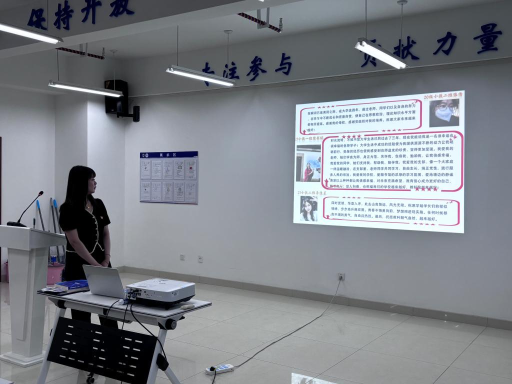 会议共有五项议程。第一项议程,党员代表进行经验交流。分别邀请支部党员国芮菁、王崇宇、袁嘉蔓和敖云格日勒进行考编考研经验交流分享,他们以优异的成绩被包头市青山区教育局、鄂尔多斯东胜区教育局和内蒙古师范大学录取。王崇宇和袁嘉蔓分别向与会同学传授了学习方法和备考经验,并从笔试、面试两个方面对教材的选择和面试技巧方面进行了全面的讲解;国芮菁从同学们关心的实习问题和毕业论文提供了有价值的建议;敖云格日勒结合自己的考研经历,详细讲解了备考期间应该注意的问题,包括考研的复习方法、学习心态、考研的计划、作息时间安排以及申请院校的心得。第二项议程,大三党员代表杨悦铭为毕业生党员送上祝福,表达了学弟学妹对他们的美好祝愿和向优秀党员学习的坚定决心。同时,全体党员在会前写下了对学校、对学院和对同学们的祝福。第三项议程,支部书记王璐然为毕业生党员赠送“政治生日贺卡”,贺卡上印有入党誓词,以及对党员同志政治生日的祝福语,时刻勉励着每一位共产党员不忘初心、牢记使命。暖心的祝福语,不仅增强了党员的幸福感和获得感,也激发了党员的责任感和使命感。第四项议程,全体党员面向党旗庄严宣誓,铿锵有力的入党誓词使在场的每一位党员都重新接受了心灵的洗礼,更加坚定了理想信念,永葆为民服务初心。最后,王璐然对毕业生党员进行廉洁教育并提出期望,她指出,将廉洁教育作为毕业生离校前的“最后一课”,旨在帮助毕业生树立遵法、崇廉、守信的人生观,是引导毕业生走好职场的第一步。她期望党员们要保持终身学习的心态,不断追求新的知识和技能;勇于追寻激情和目标。不要因为外界的压力或他人的期望而迷失自己,相信自己的选择,并为之全力以赴;要树立正确的人生观和价值观。希望进入社会后干干净净做人,明明白白做事,要以诚实、正直和责任感为准则,遵守道德底线,与人为善。党员纷纷表示要谨记教诲,在人生未来的广阔舞台上继续砥砺奋进、勇毅前行。