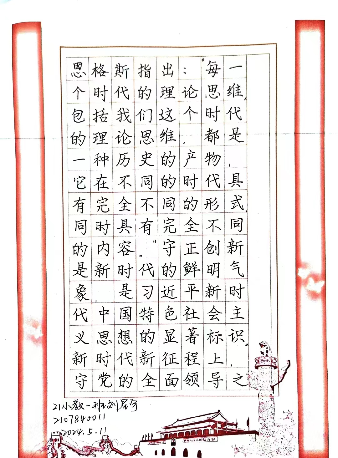 钢笔字打卡活动。5月10日-14日,学生会素质教育拓展部举办“中国梦·民族情”主题钢笔字五日打卡活动,共收到了114份优秀的书法作品。活动选材范围主要围绕摘抄党的二十大报告和二十届二中全会重要论述、金句,同学们的作品飘若浮云,矫若蛟龙,或劲键,或婉转,饱含着同学们挥斥方遒的激情,以笔墨为媒,以纸张为介,每一个汉字都体现着同学们的书法功底,一笔一画写出中国青年的自信,用硬笔书法书写出对“中国梦”的理解与感悟。