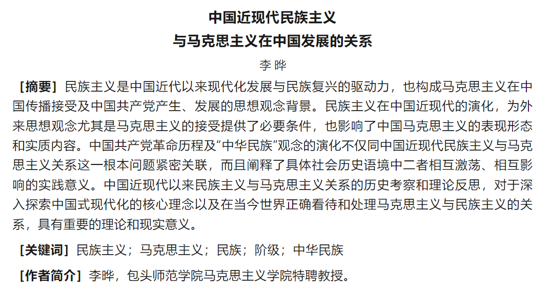 文章提出:“民族主义是中国近代以来现代化发展与民族复兴的驱动力,也构成马克思主义在中国传播接受及中国共产党产生、发展的思想观念背景。民族主义在中国近现代的演化,为外来思想观念尤其是马克思主义的接受提供了必要条件,也影响着中国马克思主义的表现形态和实质内容。中国共产党革命历程及‘中华民族’观念的演化不仅同中国近现代民族主义与马克思主义关系这一根本问题紧密关联,而且阐释了具体社会历史语境中二者相互激荡、相互影响的实践意义。中国近现代以来民族主义与马克思主义关系的历史考察和理论反思,对于深入探索中国式现代化的核心理念以及在当今世界正确看待和处理马克思主义和民族主义的关系,具有重要的理论和现实意义。”