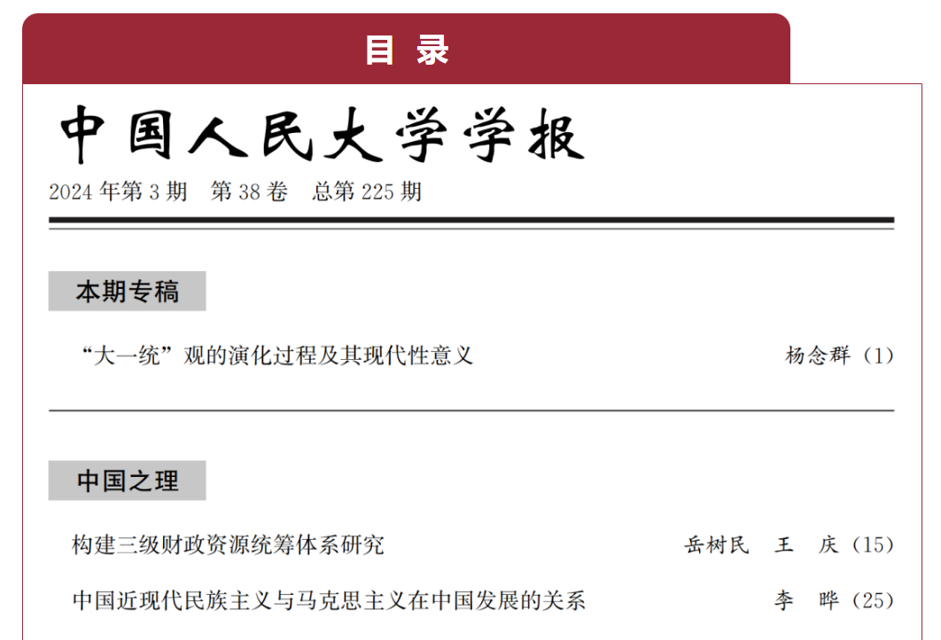 近日,由中国人民大学主办、教育部主管的人文社会科学综合性理论刊物《中国人民大学学报》(南北双核,复合影响因子4.037)公布了2024年第3期目录,我院柔性引进人才李晔教授独著论文《中国近现代民族主义与马克思主义在中国发展的关系》被收录发表。