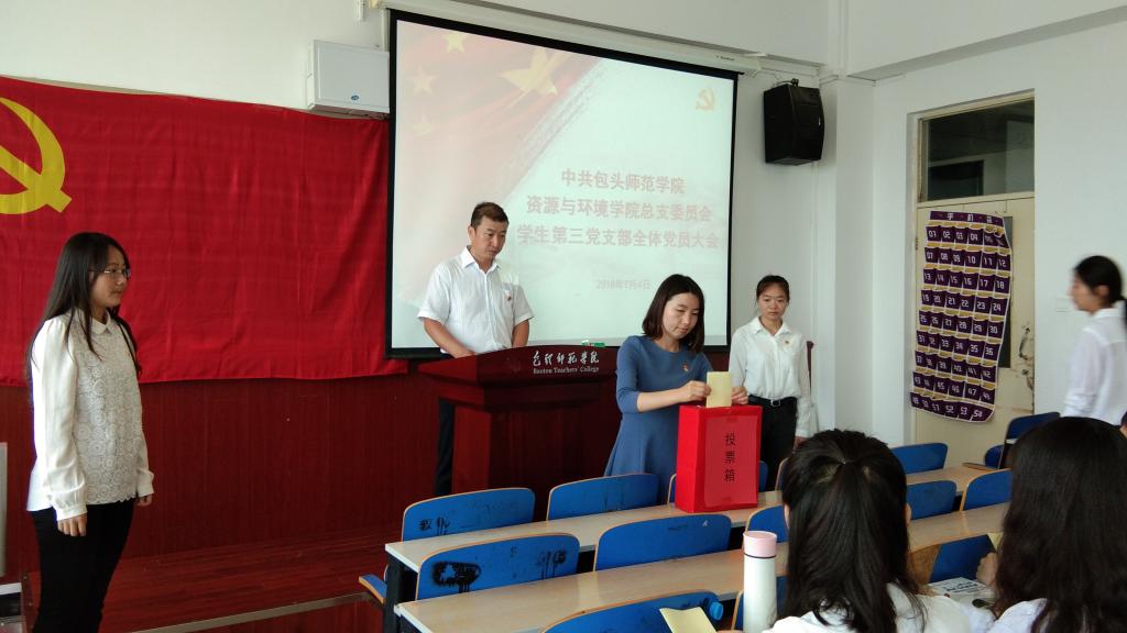 大会审议通过了《中国共产党包头师范学院资源与环境学院党总支委员会关于党支部委员会选举办法》和监票人、计票人名单。在介绍候选人基本情况后,经无记名投票方式,差额选举产生了新一届党支部委员。大会在《国际歌》声中落下帷幕。新一届支部委员会举行第一次全体会议,选举产生了支部书记并进行了委员分工。党总支委员督导和观摩学生党支部换届选举全体党员大会。