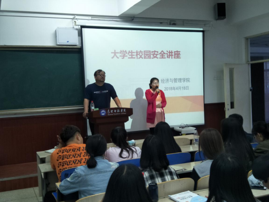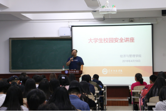 4月18日晚,经济与管理学院在博学楼400举办面向全体学生干部的“大学校园安全教育讲座”。本次讲座由保卫处消防科张晓刚执讲,我院辅导员陈丽芳主持。