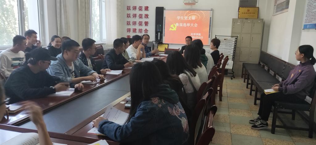 17时,化学学院学生党支部召开了党支部换届选举全体党员大会,支部党员共20人参加了大会,其中正式党员10人,预备党员10人。会议由学生党支部书记韩泽红主持。大会审议通过了《中国共产党包头师范学化学学院党总支委员会关于党支部委员会选举办法》和监票人、计票人名单。在介绍候选人基本情况后,经无记名投票方式,差额选举产生了新一届党支部委员。新一届支部委员会举行第一次全体会议,选举产生了支部书记并进行了委员分工。党总支委员督导和观摩学生党支部换届选举全体党员大会。