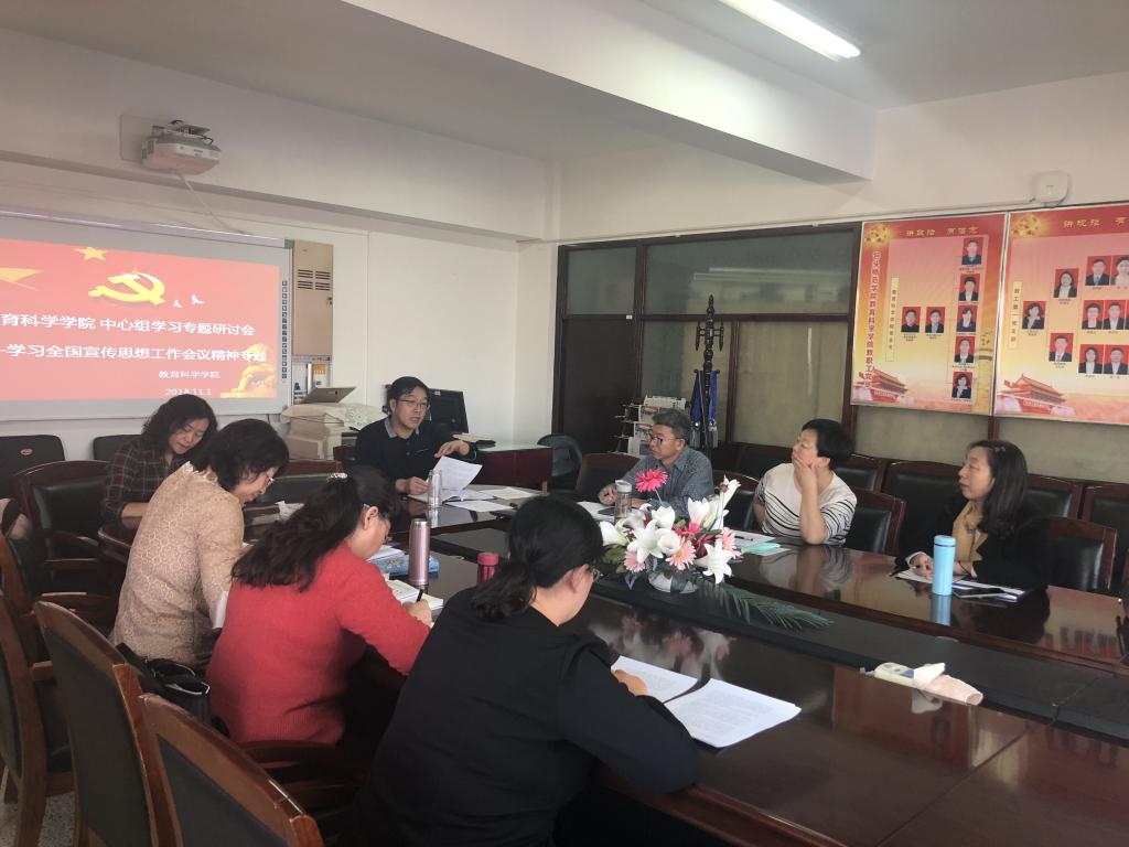 11月1日下午,教育科学学院召开“学习全国宣传思想工作会议精神”中心组专题研讨会,会议由党总支书记张岫峰主持。会议结合学习贯彻习近平总书记在全国高校思想政治工作会议上的讲话精神,结合本学院宣传思想工作、思想政治工作的实际展开研讨,10位中心组成员参加会议,其中五位中心组成员进行了发言交流。