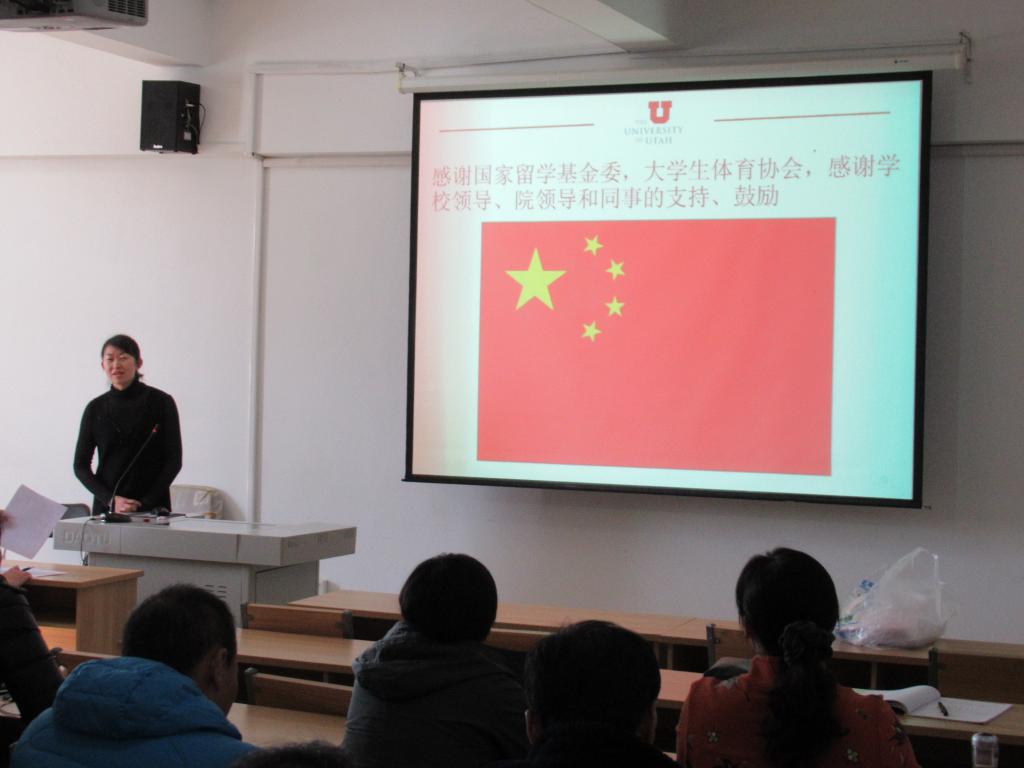 毛启霞老师通过向大家展示她在这次访学过程中获取的影像资料让大家对美国犹他大学基本情况及教学设施、条件、访学教学内容等有了详细了解。通过这次交流与分享,体育学院全体老师在教学、训练理念、教学方法、手段上获得了更多先进教学理念,了解交了国际上一些先进的体育教学设备与应用,极大得开阔了眼界,受到大家一致的欢迎和好评。(体育学院)