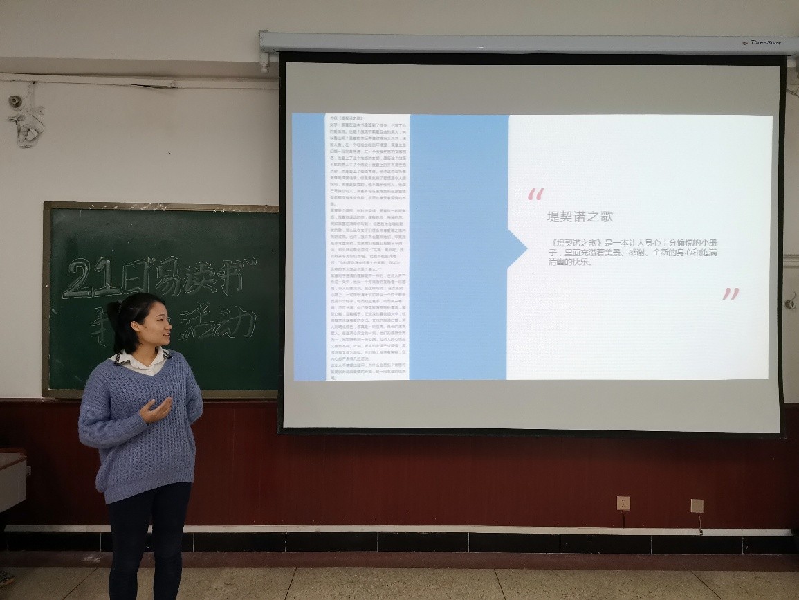 为让同学们亲近阅读,让读书成为一种习惯,资源与环境学院举办了 21天“易读书”打卡活动,11月12日在博东407进行线下心得分享及颁奖仪式。分享会上,坚持满21天的33名同学依次介绍了21天内所读书籍,其中不仅包含国内外名著,还有课程书籍。此外他们还分享了坚持21天读书后的感受,营造了良好的学习气氛。