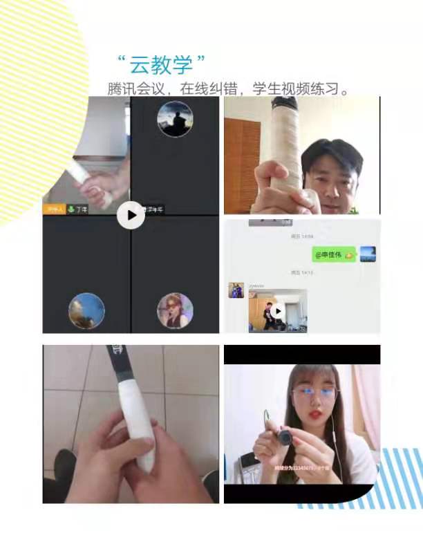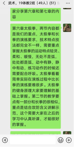 疫情期间,教师们提前设计教学内容,包括理论知识、术科动作的分解教学和完整演练以及课后作业,并录制教学视频分解动作教学讲解和完整套路演练,布置理论和术科作业,还通过学习通上传理论学习资料、术科动作的分解教学和完整演练动作视频资料,便于学生们随时学习。线上,同学们在微信群进行相互讨论,教师总结,达到更好的互动式学习。