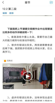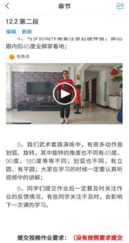 线下,同学们自学套路,通过录制基本功的单独演练、套路的完整演练视频,在学习通提交作业,教师根据提交的视频,进行单独和集体指导。