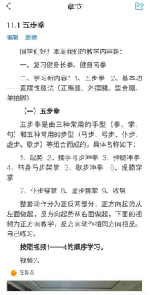 19级体育教育专业核心课《武术》采用超星学习通+微信的学习模式:教师利用超星学习通上传教学资料、武术基本功、武术套路视频等相关资料,通过资源共享,方便学生课下学习;利用微信群、超星学习通进行教学答疑、动作指导;学生进行文字或语音相互讨论,上传视频作业;教师利用学习通布置作业、回收作业、批改作业并进行动作纠错。