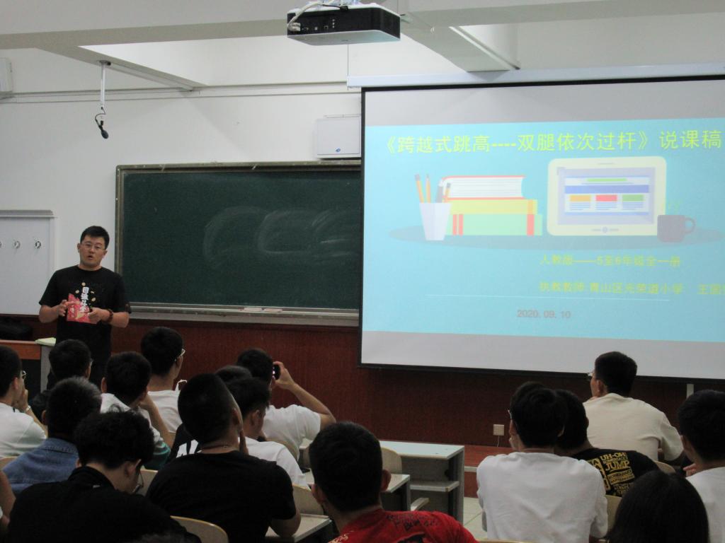 为了更好地提高体育学院学生的职业技能,强化师范生教学的基本功,同时也为了教育实习做好准备。9月8日下午,体育学院王晓澄副教授就《基于新课标下的中小学体育课堂教学设计与问题研究》为2017级的学生进行了讲解与分析。9月9日晚,青山区教育局体育调研员崔国栋老师及他的名师工作坊团队受邀为体育学院2017级学生就体育说课等相关内容进行阐述及演示。优秀体育教师王国强和王俊杰就《说课案例分析》、《基于标准的目标制定》等内容做了案例演示。