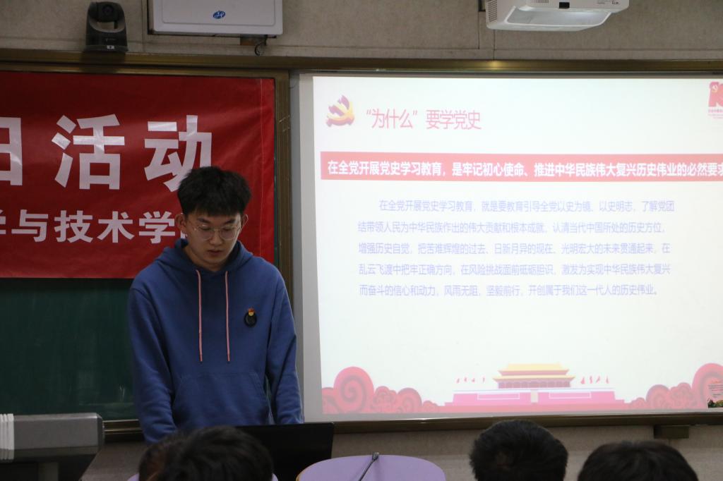活动开始,首先由范崎昊同学分享学习党史的意义,他说“作为年青的一代,认真学习党的历史,对继承和发扬光大革命传统、党的优良作风、提高自己的认识能力和处理实际问题的能力都是十分必要和有益的。”接着由李祥、张伟和孔子茹三位同学为大家介绍“为什么”要学党史、党史应该“怎么学”,他们立志要践行初心使命,一心一意跟党走,做不愚的学党史者,不慌的知史者,不乱的用史者。之后全体同学起立,由范崎昊同学带领大家重温入团誓词、入党誓词。